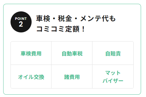 7MAXには、車両代のほかに、車検代、自動車税、オイル点検などの維持費用が含まれるので、突然の出費を考えることがなく家計においても余裕がでてきます。